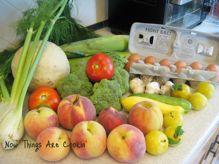 | Fennel, cantaloupe, corn, eggs, garlic, yellow plums, zucchini and squash, peaches, tomatoes, and broccoli. |